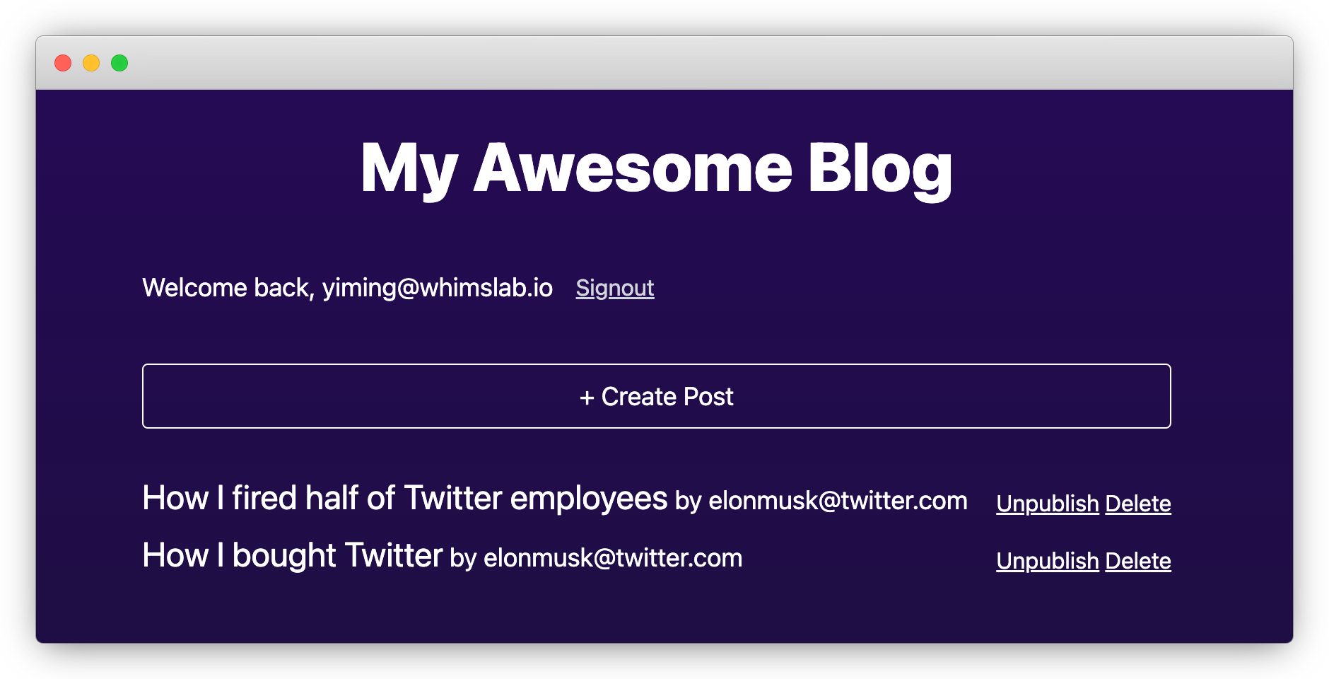 Restart the dev server and try creating a few posts. You should see something like the following: